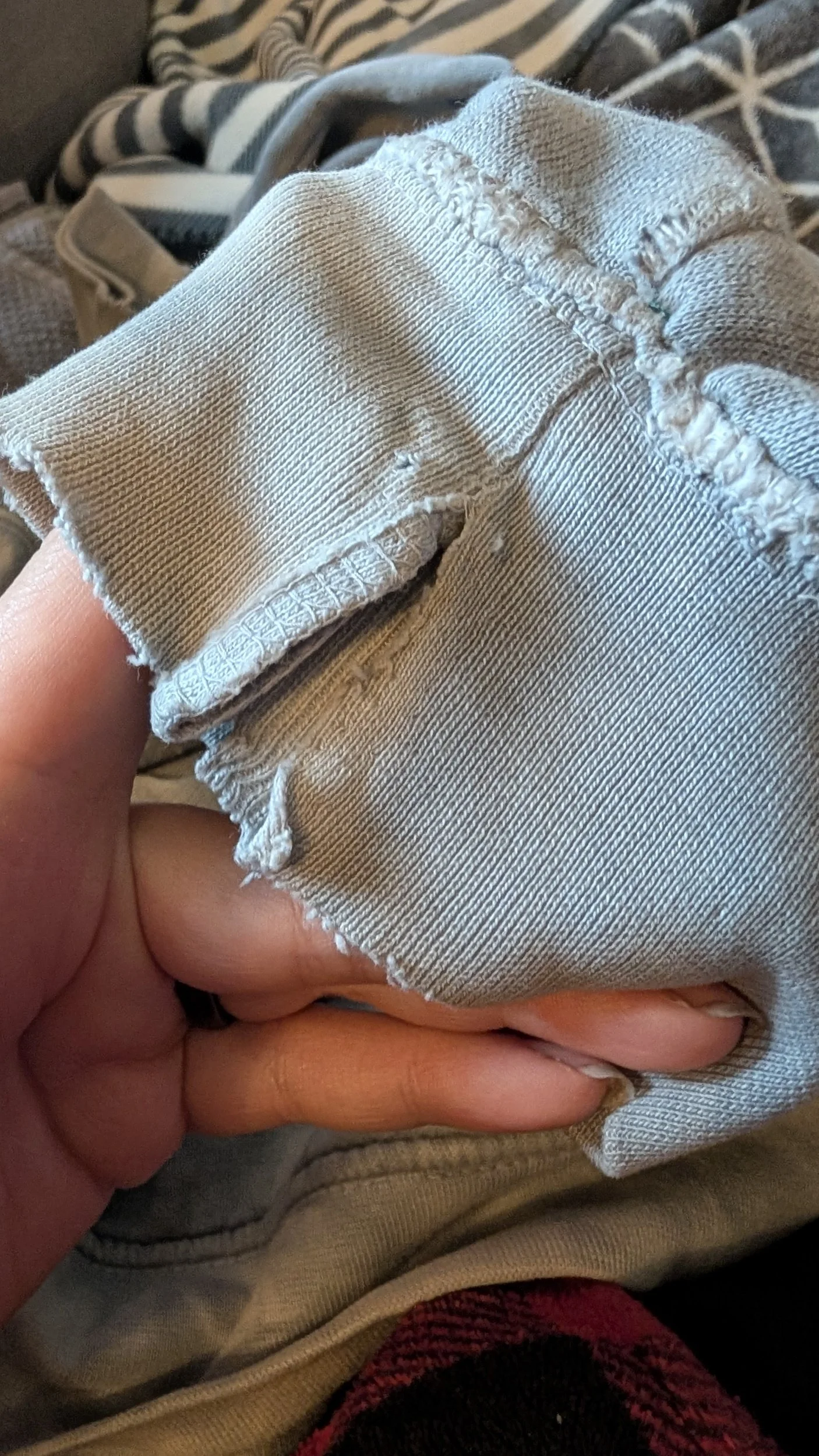 Holes in sweaters, pants, shirts, and socks that are less than 1 inch in diameter